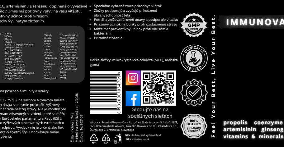 IMMUNOVA je doplněk stravy, který obsahuje unikátní směs artemisininu, propolisu, koenzymu Q10 s korejským ženšenem, doplněnou vyváženým množstvím vitamínů a minerálů, která pomáhá posilovat obranyschopnost a imunitní systém, dokáže preventivně působit proti virům a bakteriím a má pozitivní vliv na vitalitu celého organismu.