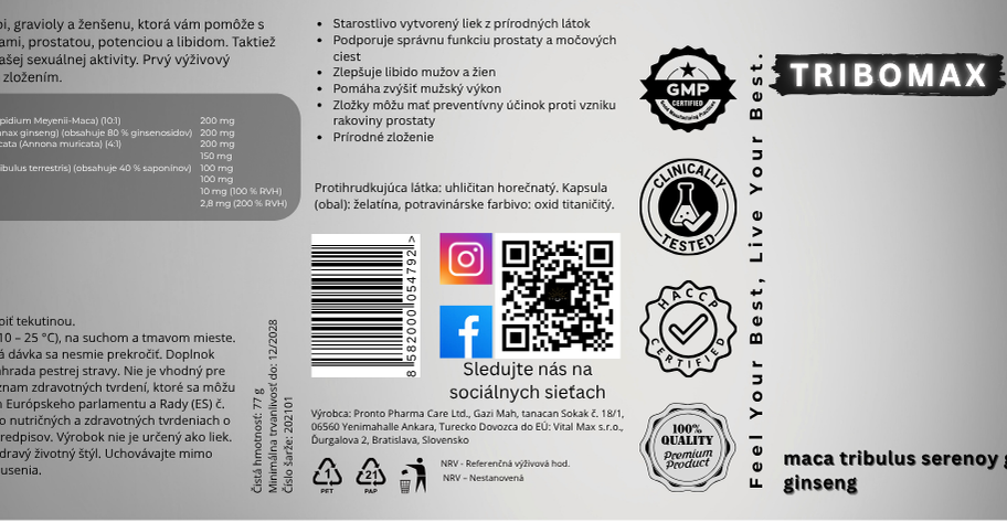 TRIBOMAX je doplněk stravy obsahující unikátní směs Macy, Tribulusu, Serenoy, Gravioly a Ženšenu, která může pomoci s problémy s močovými cestami, prostatou, potencí a libidem, což přispívá ke zvýšení sexuální aktivity.